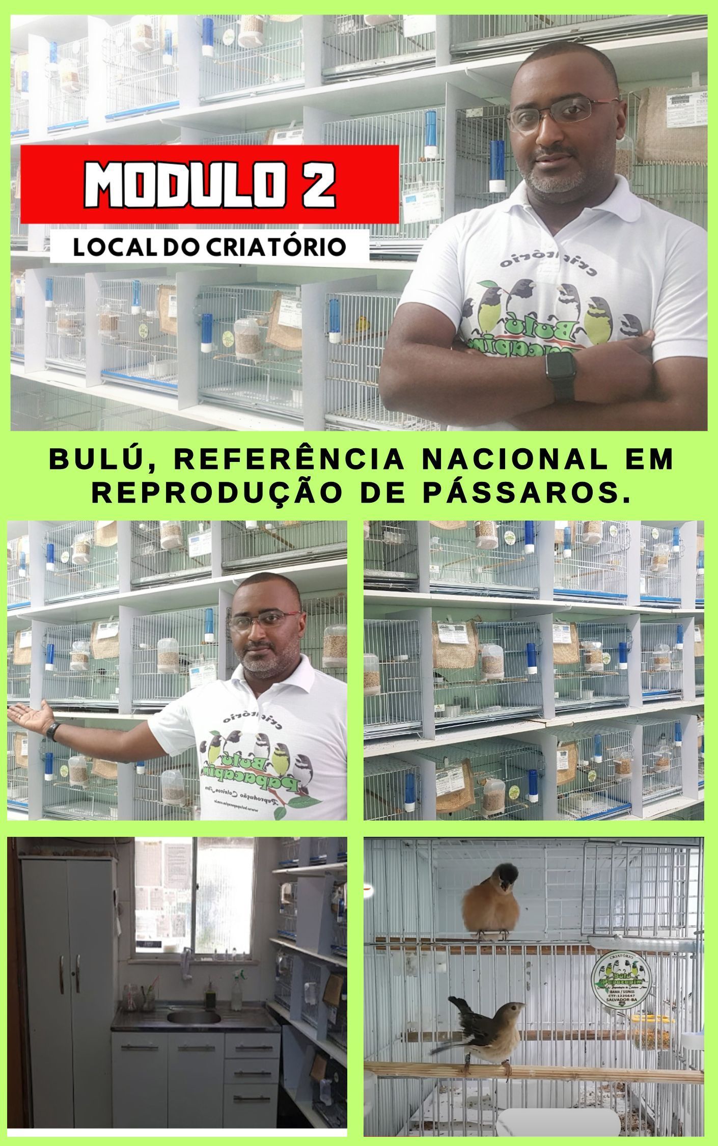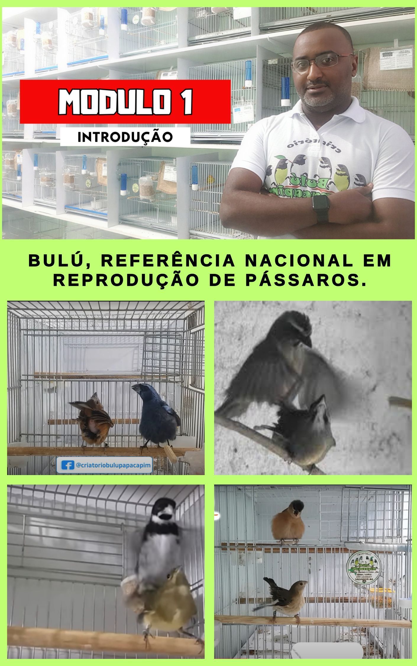 Iniciei a criação de pássaros ainda criança, quando ganhei um coleiro baiano (papacapim) de minha vó materna em 1984. Hoje sou proprietário do criatório Bulú papacapim e reproduzo pássaros há mais de 30 anos. Já ajudei grandes criadores Brasil a for a reproduzirem seus pássaros campeões preservando e perpetuando suas qualidades e características comportamentais em seus criatórios através de nossas dicas, manejos e macetes na reprodução em ambiente doméstico.